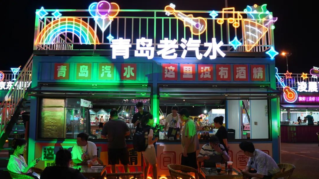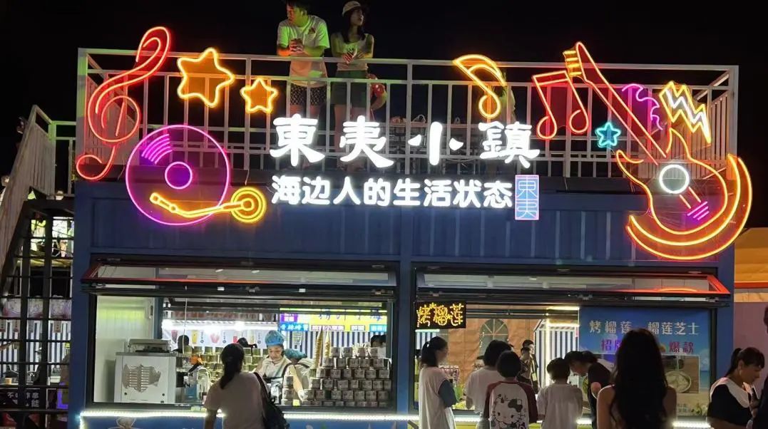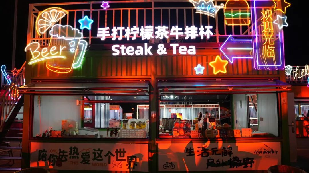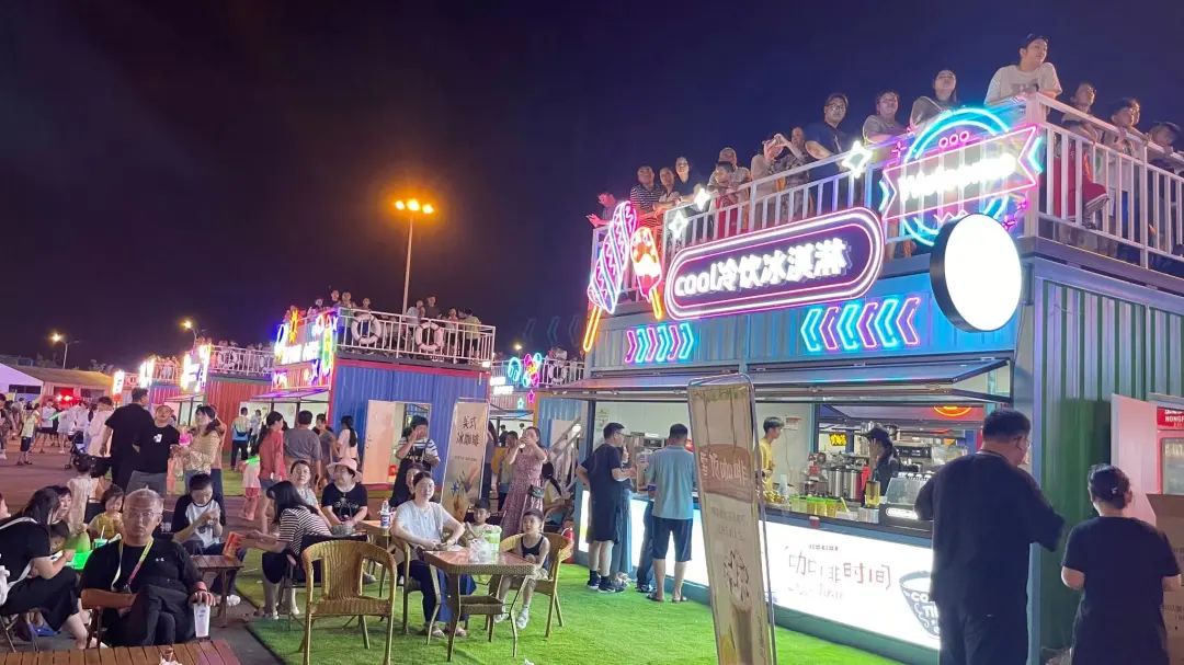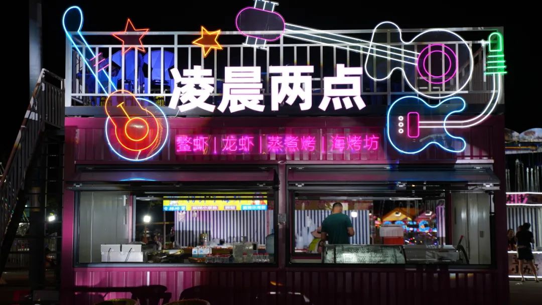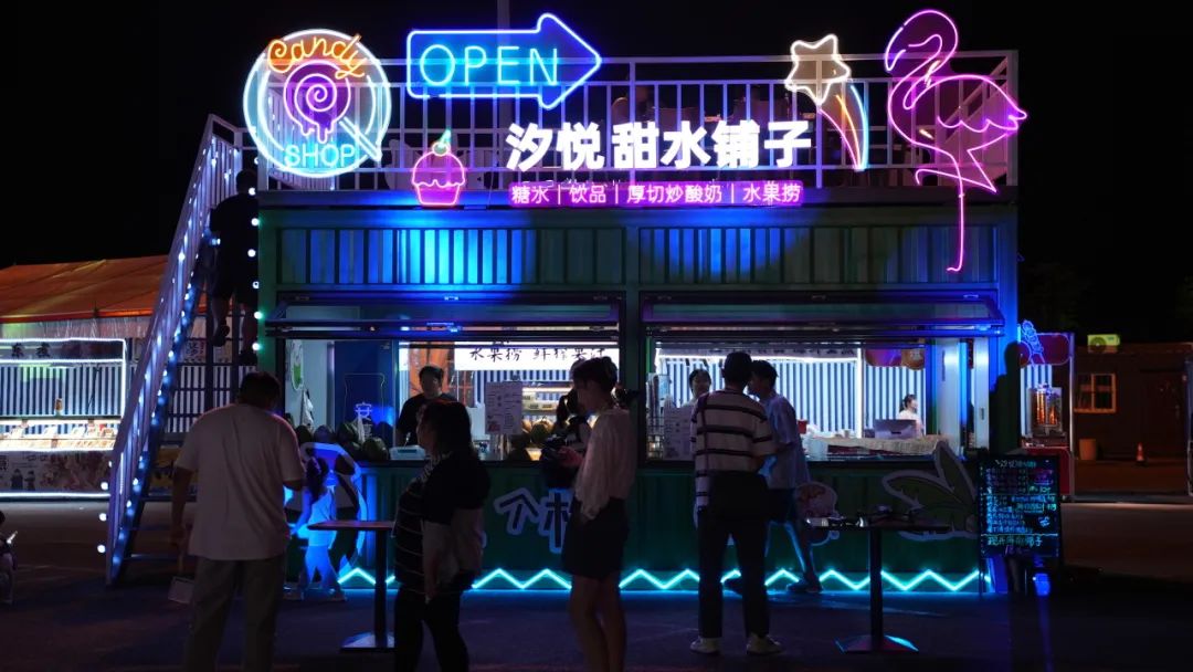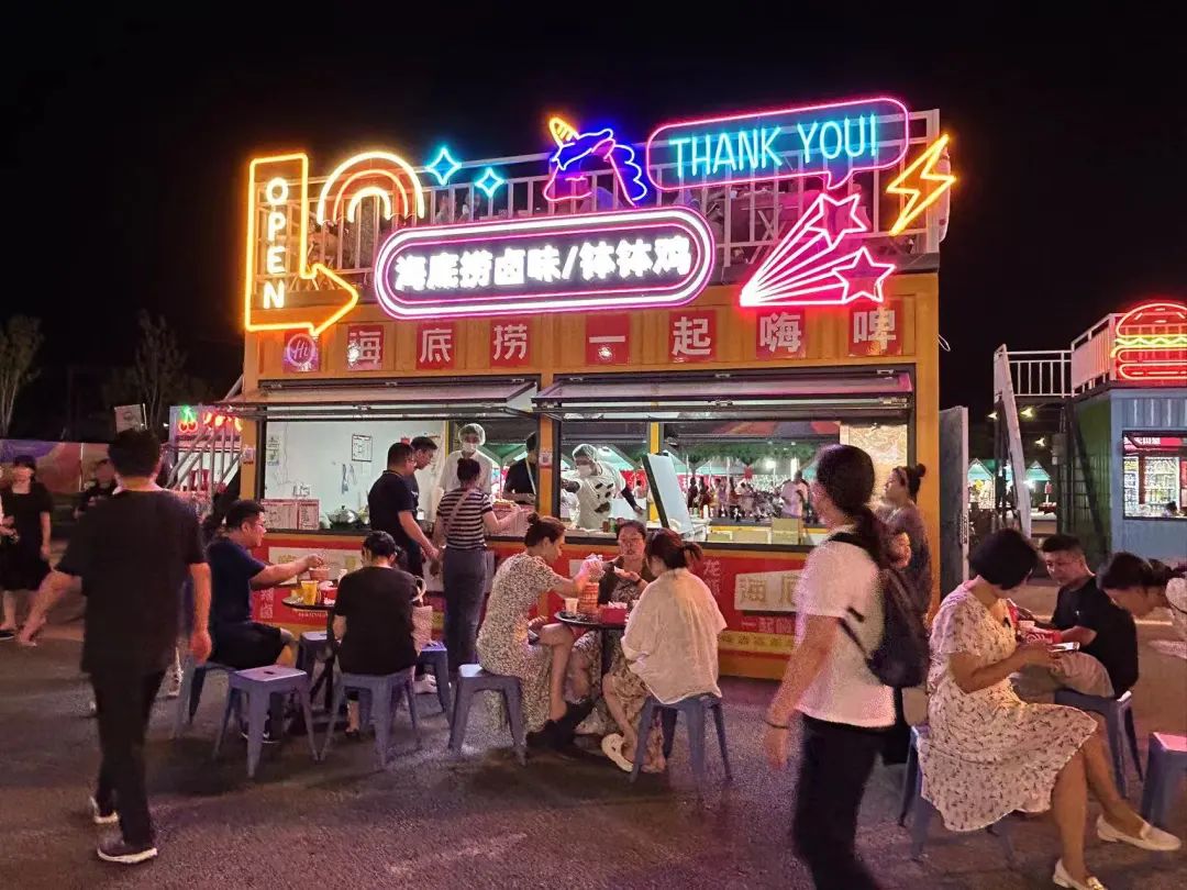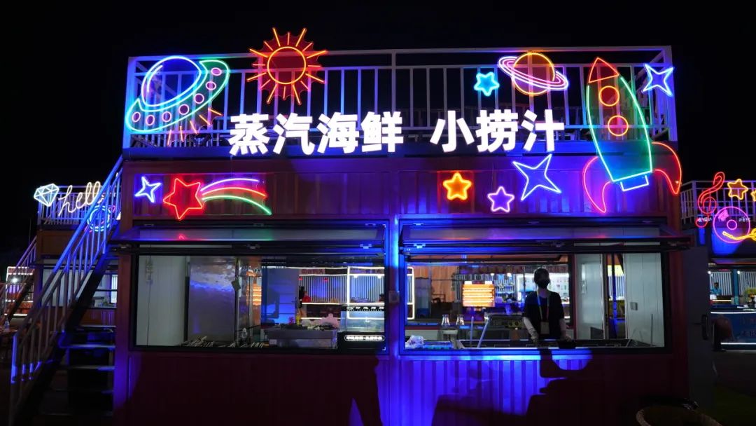 霓虹灯闪烁,美食好吃又好看。集装箱市集共有十余家美食,冷饮、冰淇淋、卤味、海鲜、甜水、网红特色小吃等等应有尽有。