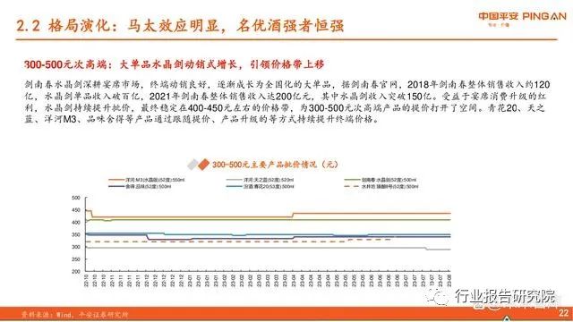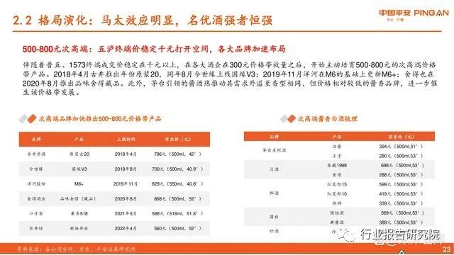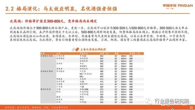 次高端:价格带扩容至300-800元,竞争格局尚未确定。次高端指价格位于300-800元的白酒产品,更进一步,次高端可以划分为300-500元与500-800元价格带。300-500元由大单品 剑南春水晶剑引领,五泸终端价稳定千元以上后,500-800元同样快速发展,但整体格局尚未确立。根据公司销售半径的不同, 次高端白酒包括以山西汾酒、舍得酒业、水井坊、剑南春等为代表的全国性次高端,以及以古井贡酒、今世缘、口子窖为代 表的区域性次高端。与此同时,茅台引领酱香型白酒快速发展,习酒、郎酒、国台等二线酱酒在次高端价格带产品同样丰富。