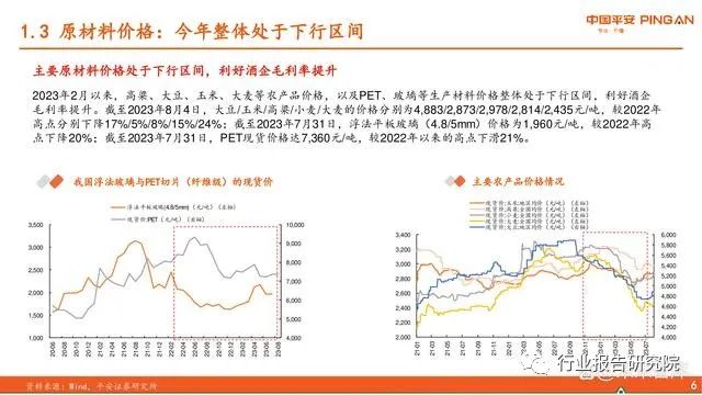 主要原材料价格处于下行区间,利好酒企毛利率提升。2023年2月以来,高粱、大豆、玉米、大麦等农产品价格,以及PET、玻璃等生产材料价格整体处于下行区间,利好酒企 毛利率提升。截至2023年8月4日,大豆/玉米/高粱/小麦/大麦的价格分别为4,883/2,873/2,978/2,814/2,435元/吨,较2022年 高点分别下降17%/5%/8%/15%/24%;截至2023年7月31日,浮法平板玻璃(4.8/5mm)价格为1,960元/吨,较2022年高 点下降20%;截至2023年7月31日,PET现货价格达7,360元/吨,较2022年以来的高点下滑21%。