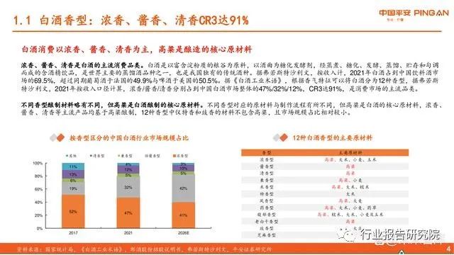 白酒消费以浓香、酱香、清香为主,高粱是酿造的核心原材料。浓香、酱香、清香是白酒的主流消费品类。白酒是以富含淀粉质的粮谷为原料,以酒曲为糖化发酵剂,经蒸煮、糖化、发酵、蒸馏、贮存和勾调 而成的含酒精饮品,是世界主要的蒸馏酒品种之一,也是我国独有的传统酒种。据弗若斯特沙利文,按收入计,2021年白酒占到中国饮料酒市 场的69.5%,超过同期葡萄酒于法国的49.9%与啤酒于美国的50.5%。据《白酒工业术语》,根据香气特征可以将白酒分为12种香型,据弗若斯 特沙利文,2021年按收入口径计算,浓香/酱香/清香分别占到中国白酒市场整体的47%/32%/12%,CR3达91%,是消费市场的主流品类。 不同香型酿制材料略有不同,但高粱是白酒酿制的核心原材料。不同香型对应的原材料与制作流程有所不同,但高粱是白酒的核心原材料,浓香、 酱香、清香等主流产品均基于高粱酿制,12种香型中仅特香和豉香的材料不包含高粱,且市场规模占比相对较小。