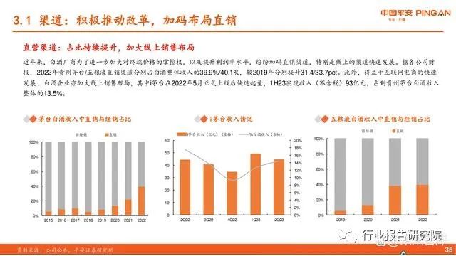 直营渠道:占比持续提升,加大线上销售布局。近年来,白酒厂商为了进一步加大对终端价格的掌控权,以及提升利润率水平,纷纷加码直销渠道,特别是线上的渠道快速发展。据各公司财 报,2022年贵州茅台/五粮液直销渠道分别占白酒整体收入的39.9%/40.1%,较2019年分别提升31.4/33.7pct。此外,得益于互联网电商的快速 发展,白酒企业亦加大线上销售布局,其中i茅台在2022年5月正式上线后快速起量,1H23实现收入(不含税)93亿元,占到贵州茅台白酒收入 整体的13.5%。