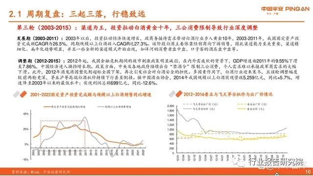 第三轮(2003-2015):渠道为王,投资拉动白酒黄金十年,三公消费限制导致行业深度调整。