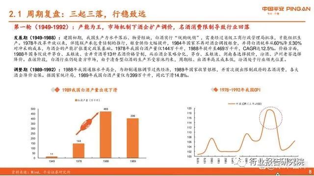 第一轮(1949-1992):产能为王,市场机制下酒企扩产调价,名酒消费限制导致行业回落。