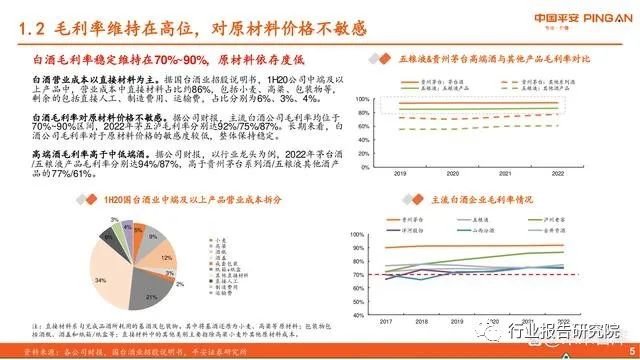 白酒毛利率稳定维持在70%~90%,原材料依存度低。白酒营业成本以直接材料为主。据国台酒业招股说明书,1H20公司中端及以 上产品中,营业成本中直接材料占比约86%,包括小麦、高粱、包装物等, 剩余的包括直接人工、制造费用、运输费,占比分别为6%、3%、4%。 白酒毛利率对原材料价格不敏感。据公司财报,主流白酒公司毛利率均位于 70%~90%区间,2022年茅五泸毛利率分别达92%/75%/87%。长期来看,白 酒公司毛利率对于原材料价格的敏感度较低,整体保持稳定。 高端酒毛利率高于中低端酒。据公司财报,以行业龙头为例,2022年茅台酒 /五粮液产品毛利率分别达94%/87%,高于贵州茅台系列酒/五粮液其他酒产 品的77%/61%。