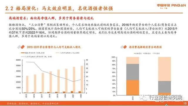 高端酒需求:面向高净值人群,多用于商务宴请与送礼。据糖酒快讯,“三公消费”限制政策颁布后,个人需求快速承接此前的政务需求,2016年购买茅台的个人需求/商务需求占 比分别达50%/25%。据国家统计局和国酒财经,人均可支配收入可购买的茅台数量(人均可支配收入/茅台批价)从2015年 的37瓶下滑到2022年16瓶,但同期茅台酒的销量依然稳定增长,我们认为这表明高端白酒的刚性需求,且受众主要为高净 值人群,多用于高端宴请以及送礼。