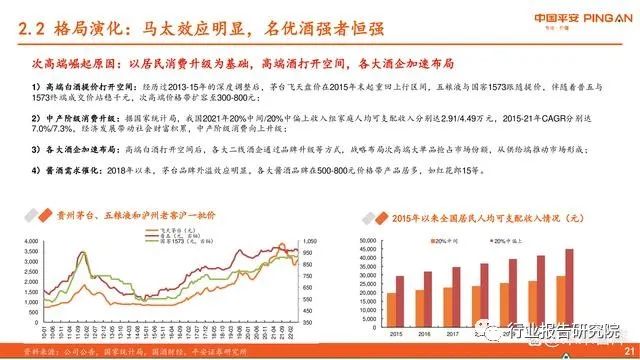 2016以来,人均可支配收入快速增长、高净值人群扩容,居民个人消费接力政军消费,成为白酒需求的新增长极。名优酒企强者恒强,龙头议 价能力提升,产品护城河持续拓宽,行业马太效应明显,白酒价格整体呈上升态势,白酒指数(中信)也随之上行。2018年受中美贸易战、宏 观去杠杆等因素影响,指数整体回撤,但高端与次高端白酒企业收入实际稳健。2019年白酒指数触底回升,2020年疫情下市场整体流动性宽 松,白酒估值持续上行。受疫情多点散发扰动实体经济、房地产增速下滑等因素影响,3Q21以来中国宏观基本面承压、GDP增速下行,白酒指 数与估值均有回落,但估值回撤幅度明显高于指数,中国的白酒企业疫情扰动下基本面仍然保持稳健。此外,厂商对于品牌的重视度持续提升, 竞争逐渐由经销渠道转向终端的消费者,直营渠道占整体销售的比例快速提升。