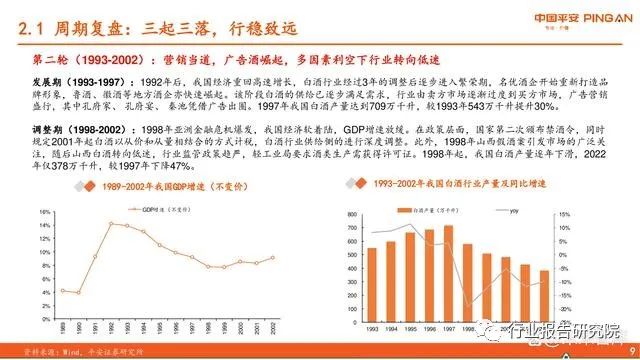 调整期(1989-1992):1988年我国通胀水平高企,为抑制通胀调节过热经济,1989年国家收紧银根,并首次提出限制政府的名酒消费,各大 酒企降价自保。据国家统计局,1989年我国白酒产量仅为399万千升,同比下滑14.8%。