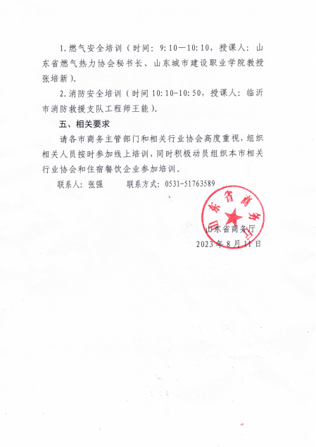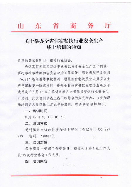 山东省商务厅将于2023年8月16日9:10-10:50,举办全省住宿餐饮行业安全生产培训,请各会员单位、住宿餐饮企业高度重视,积极组织单位人员按时参加线上培训。
