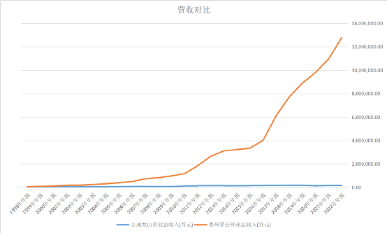 星空君发现一个有意思的现象,古越龙山和贵州茅台差不多同时上市,1998年的时候二者的营收规模是3.9个亿和6.2个亿,差别不是很大。2022年的时候分别是16个亿和1.28万亿,差别已经非常离谱了。