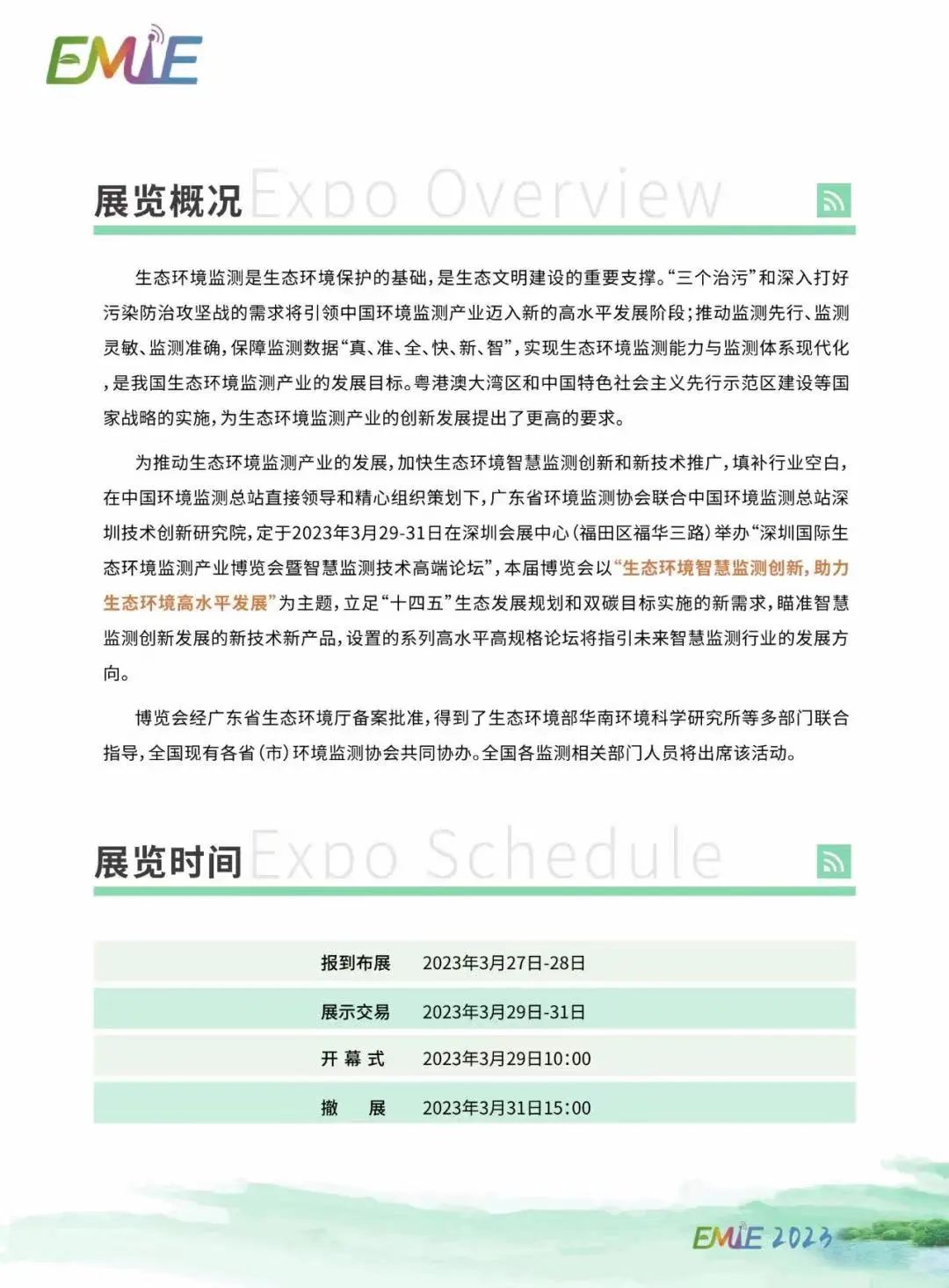 为推动生态环境监测产业的发展,加快生态环境智慧监测创新和新技术推广,填补行业空白,在中国环境监测总站和生态环境部华南环境科学研究所的指导策划下,广东省环境监测协会联合中国环境监测总站深圳技术创新研究院和一带一路环境技术交流与转移中心(深圳)定于2023年3月29-31日在深圳会展中心(福田区福华三路)举办“2023深圳国际生态环境监测产业博览会暨智慧监测技术高端论坛”(以下简称“博览会”)