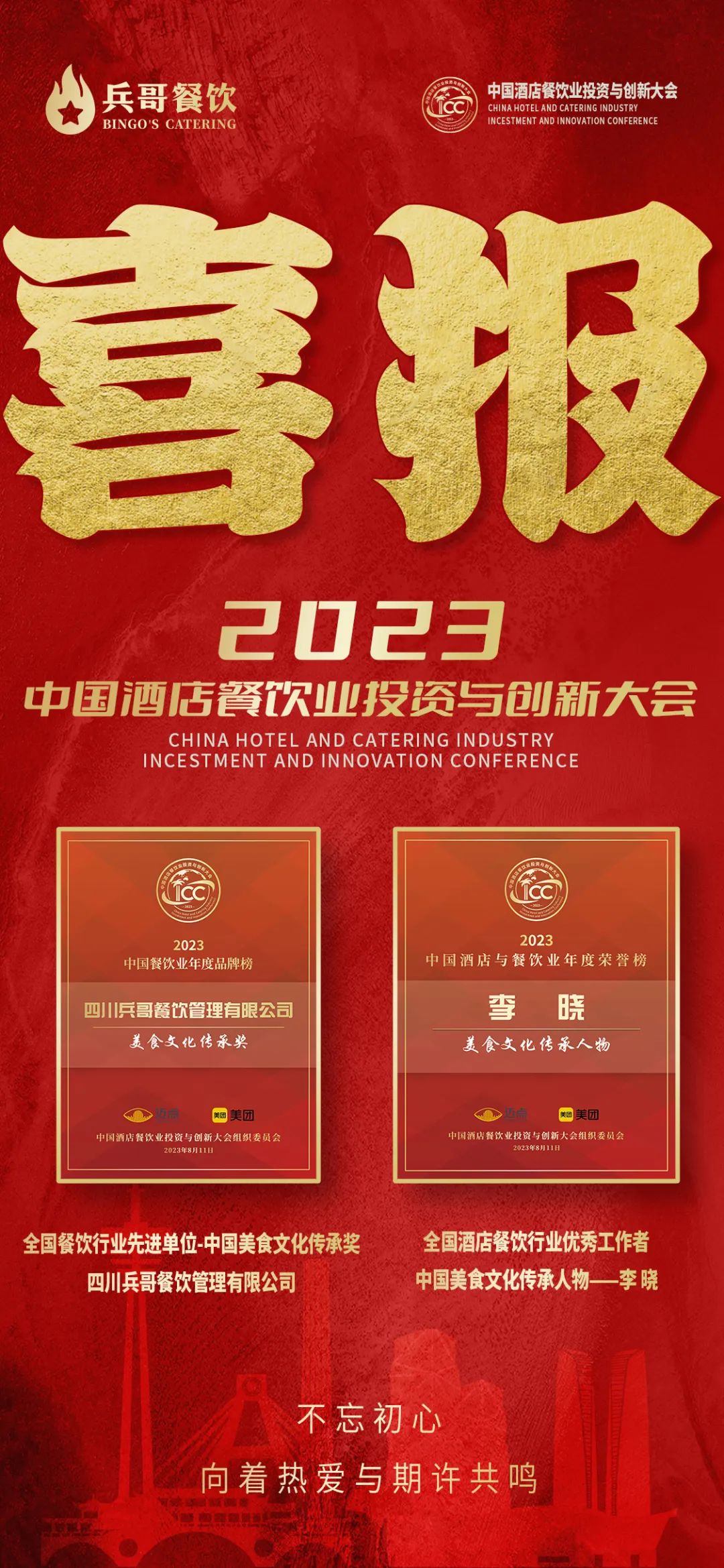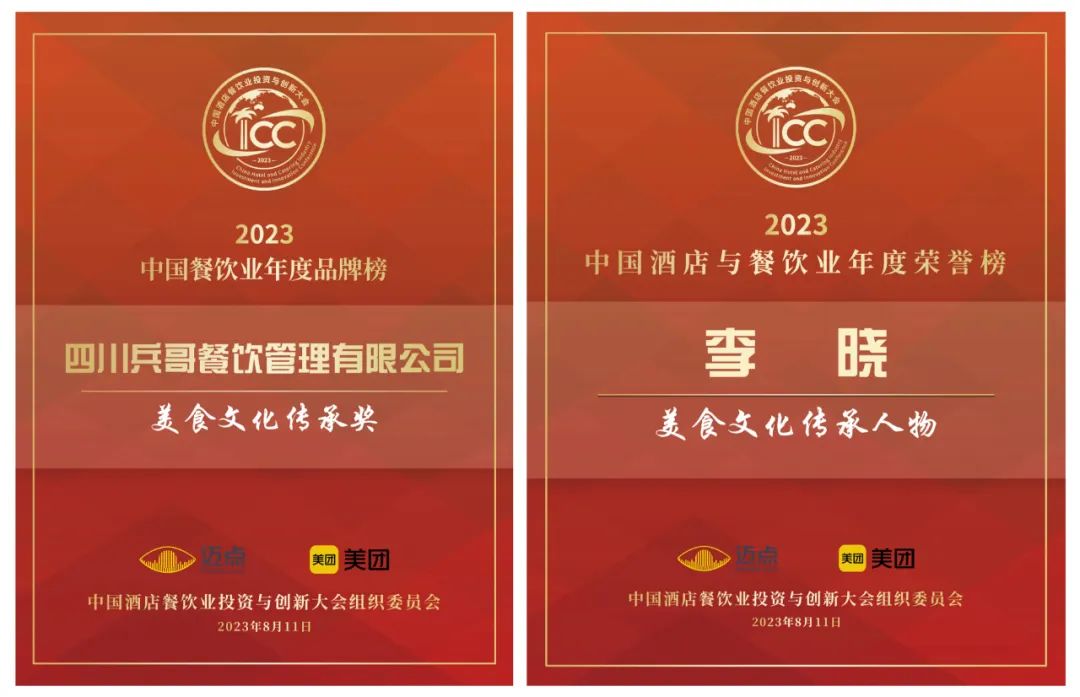 兵哥豌豆面作为中国西南地区粉面类头部连锁品牌,持续在行业赛道领跑十年,祝贺领军人李晓带着兵哥豌豆面——喜获《2023 中国酒店餐饮业投资与创新大会》组委会授予的“全国酒店餐饮行业优秀工作者——美食文化传承人物”&“全国餐饮行业先进单位——美食文化传承奖”两项荣誉。