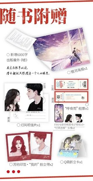 银河海报+灯风明信片+苏他印签拍立得+Q萌折立卡+“呼唤雨”船票+电子赠品。