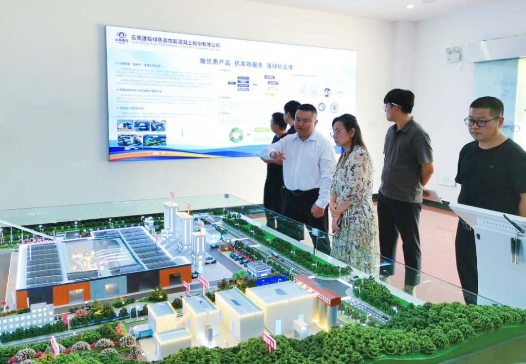 8月13日下午,江西省宜丰县兴宜农业投资开发有限公司(以下简称“宜丰农投”)总经理龚妍、副总经理刘德林、财务总监林利芬、工程部朱金鑫一行到访云建绿砼,参观公司经开绿色低碳建材产业园,探讨绿色低碳建材产业园建设、新业务范畴拓展及混凝土行业转型合作业务。公司党委副书记、副董事长、总经理张龙,副总经理刘仁智出席。