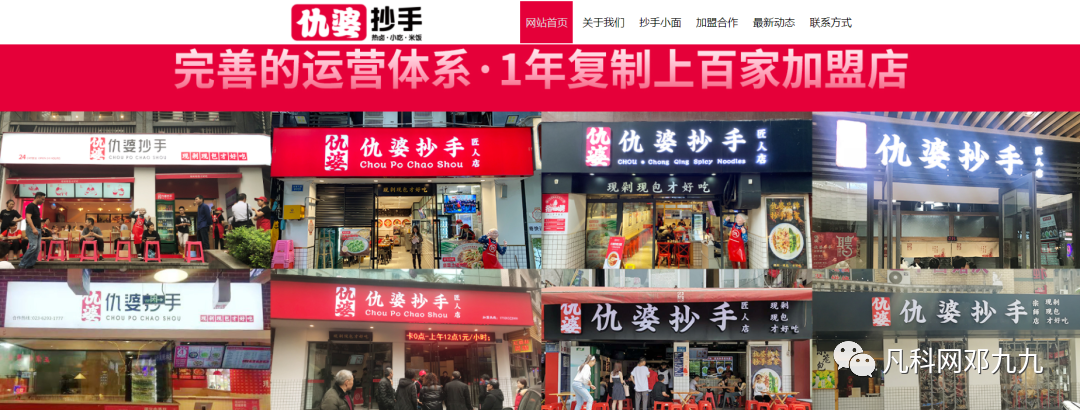 第三个案例:仇婆抄手,比较传统的餐饮品牌店,就应该选取与品牌门店风格定位符合的网站风格,用最简单明了的布局,展示品牌方信息优势