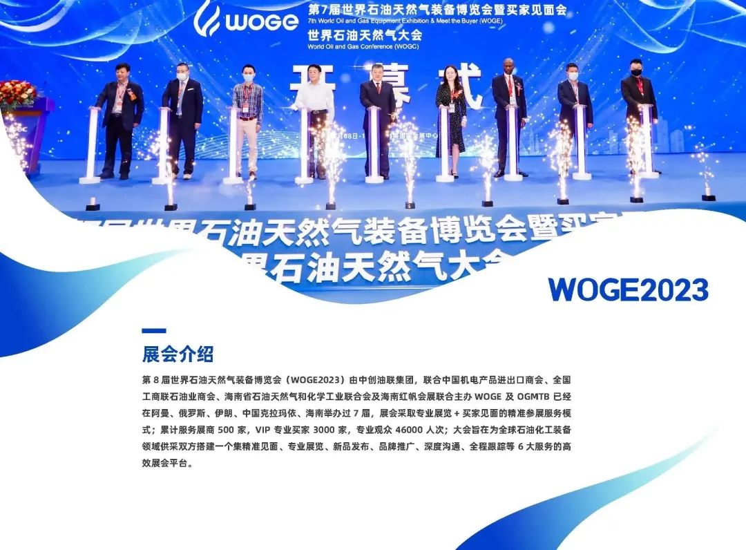 截至目前,WOGE已成功在阿曼、伊朗、俄罗斯、中国成功举办7届,累计服务参展商1600家、专业买家7200家,被誉为“中国石油化工领域的广交会”。第七届WOGE(2022年)得到海南省和海口市政府的大力支持,海南省石油天然气和化学工业联合会为其联合主办单位,海南省贸促会、海口市商务局为其支持单位,支持引进该展会永久落户海口。本届博览会为继2022年后第二次在海口举办。