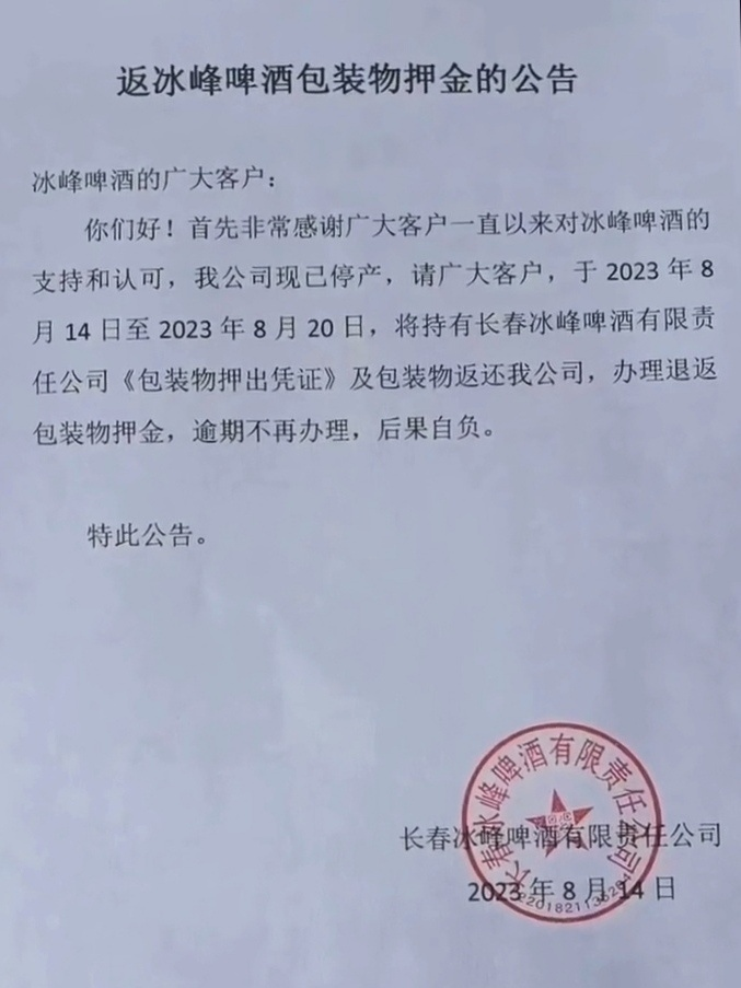 8月14日,长春仅存的地产啤酒品牌冰峰啤酒宣布停产。公告称:“尊敬的广大客户,感谢您一直以来对冰峰啤酒的支持和认可。由于经营不善,我公司现已停产。请您于2023年8月14日至2023年8月20日将《包装物押出凭证》及包装物返还我公司,逾期不再办理,后果自负。特此公告!”