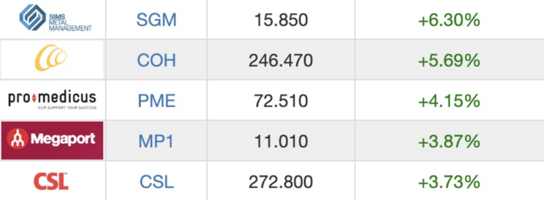 ASX200涨幅排在前5的公司: