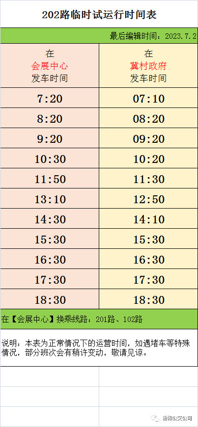 各位乘客:您好!202路(原2路)公交车于2023年7月1日恢复运行,时间表和站点明细如下图(如有变动,公众号另行通知): 202路公交车市内终点站为【会展中心】,可换乘102路、201路公交车(201路终点站暂时还是永安口)。【温馨提示】因今年所有公交线路都进行了大幅度的调整,导致部分公交线路和时间需要在运行过程中需进行持续优化,调整后的线路信息会第一时间在公众号公布,优化期间给您带来的不便,敬请见谅!