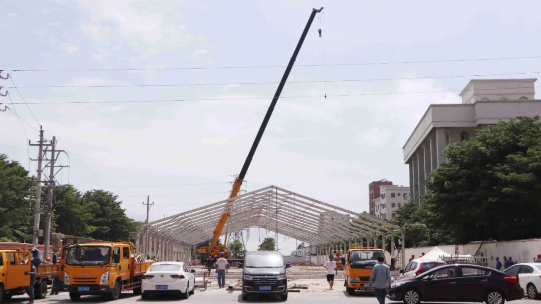 “把这几个架子拖到那边去。”“这个顶棚要再加固一下。”在吴川市金沙广场现场,施工用车来回穿梭,工人们正忙着运输各种器材和用具,一个个顶棚有序搭建。