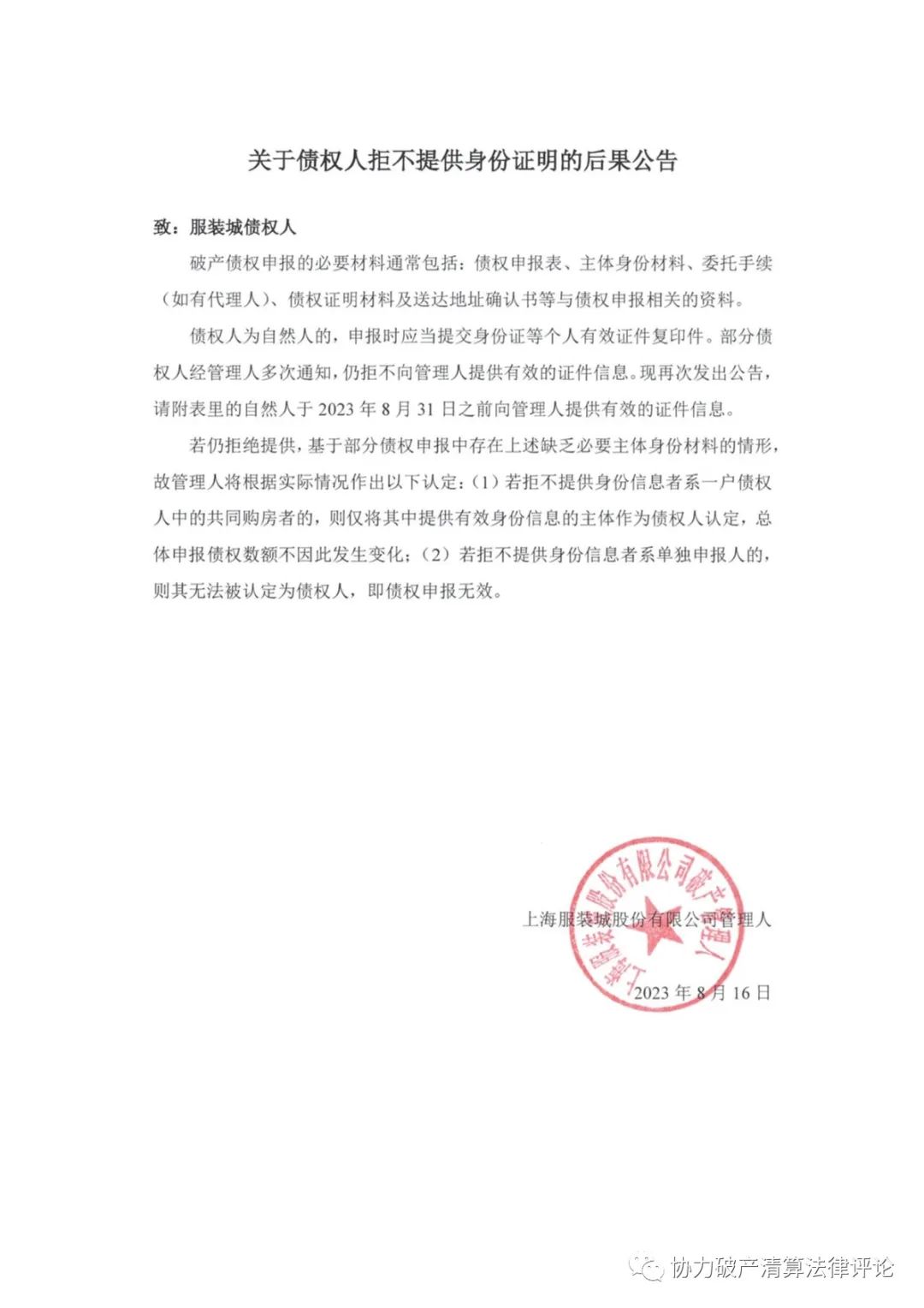 致:服装城债权人
