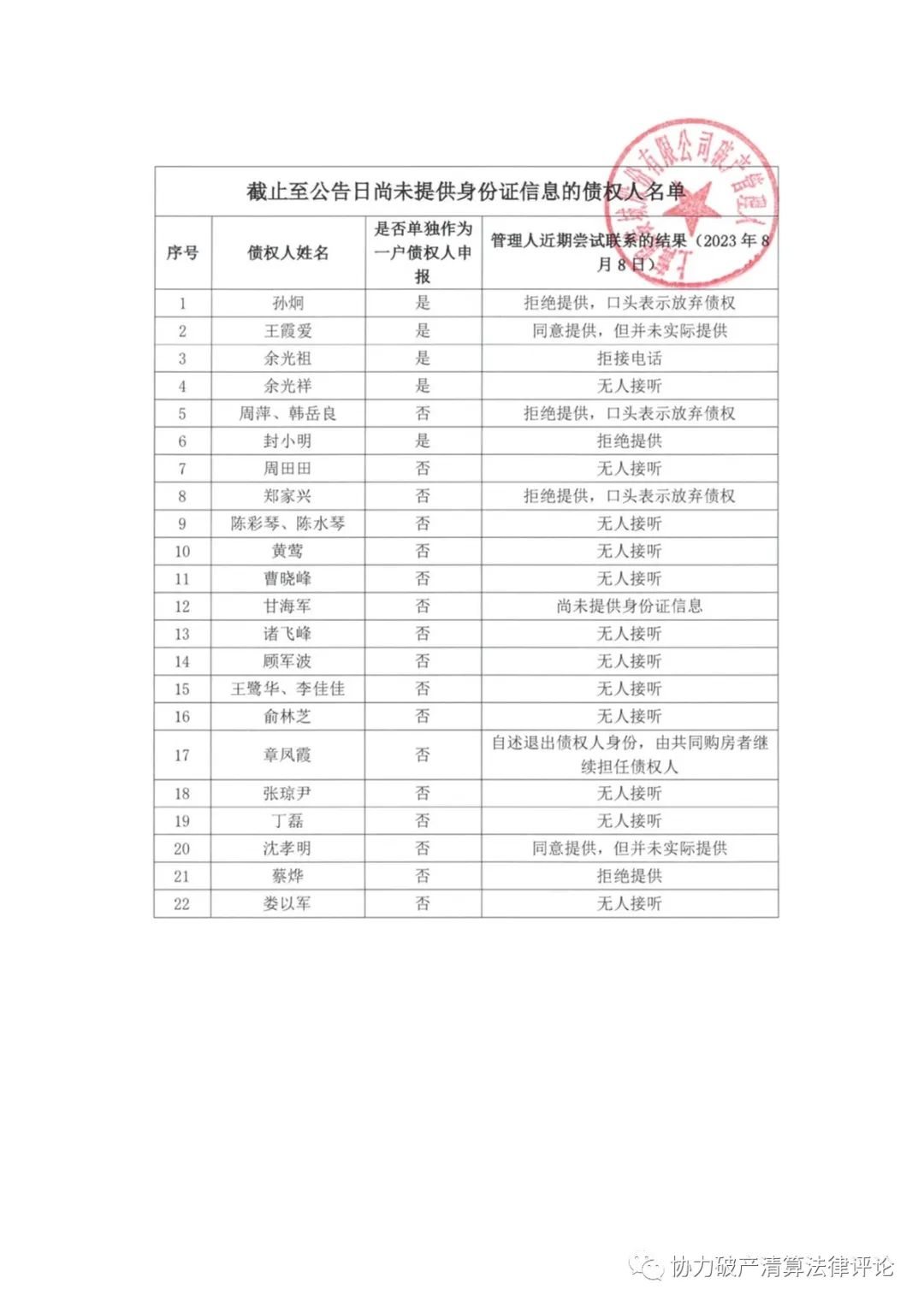 债权人为自然人的,申报时应当提交身份证等个人有效证件复印件。部分债 权人经管理人多次通知,仍拒不向管理人提供有效的证件信息。现再次发出公告, 请附表里的自然人于 2023 年 8 月 31 日之前向管理人提供有效的证件信息。
