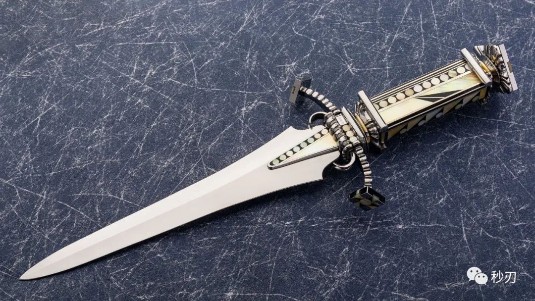 大师顶配,上书名作,外形独特的高难度艺术短剑!由美国刀剑大师劳埃德·哈里手工制作,孤品唯一。劳埃德60年代开始做刀,是美国手工刀界的元老人物。70年代开发在刀刃上面的复杂背花款式博伊刀获得超赞口碑,随之获得了当时其他职业手工匠无法想象的5年期订单被刀界家喻户晓。刀匠协会主席吉尔在制刀领域也受过劳埃德不少的帮助和影响。1981年劳埃德受到美国酒业龙头大老板奥斯利·法兹尔的青睐,奥斯利将劳埃德邀请到自己的农场,从此劳埃德彻底从刀界消失了,直到2008年为奥斯利制作了300多把手工刀之后,劳埃德才从新回到刀圈这个公众平台上面。奥斯利精选了数十把精品将其陈列在自己的博物馆里,让来观礼的人流连忘返。从回刀圈的劳埃德早已经过大师历练,很快再次以他的稀世风格得到当今刀剑收藏界泰斗的认可。
