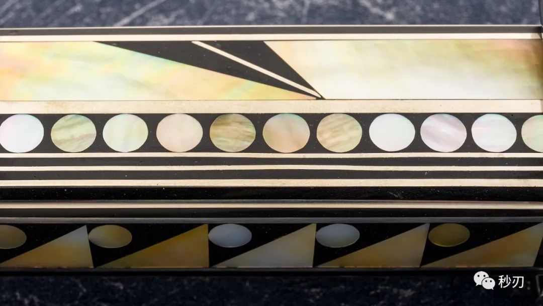 这件作品的贝母镶嵌组合非常考究,如同车水马龙的道路信号灯,也似摩登大楼华丽的窗户照射出来的奇幻光彩。