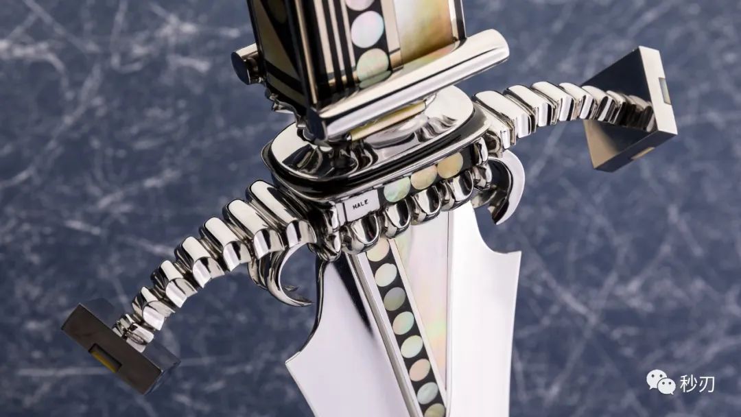 护手与剑柄采用416不锈钢制成,外形如同一座时尚的大楼。整件作品采用了大量的手工锉刀工艺来打造繁复的细节,同时贝母的马赛克镶嵌也非常让人眼花缭乱,在劳埃德作品中的复杂程度也名列前茅,只有通过卓越的匠心以及大量的耗时才得以实现这一惊人的钢铁艺术奇观。