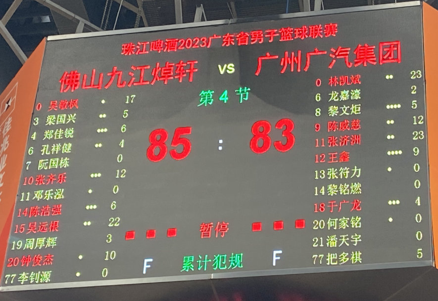此时佛山队领先着广州队4分。而后广州队的上篮也被吴远根盖掉,为球队涨了一波士气。不过广州队沉着应付,随着佛山队边线球发球失误,林凯斌抢断上篮命中,双方再度战平!见势不妙的佛山队迅速请求暂停。