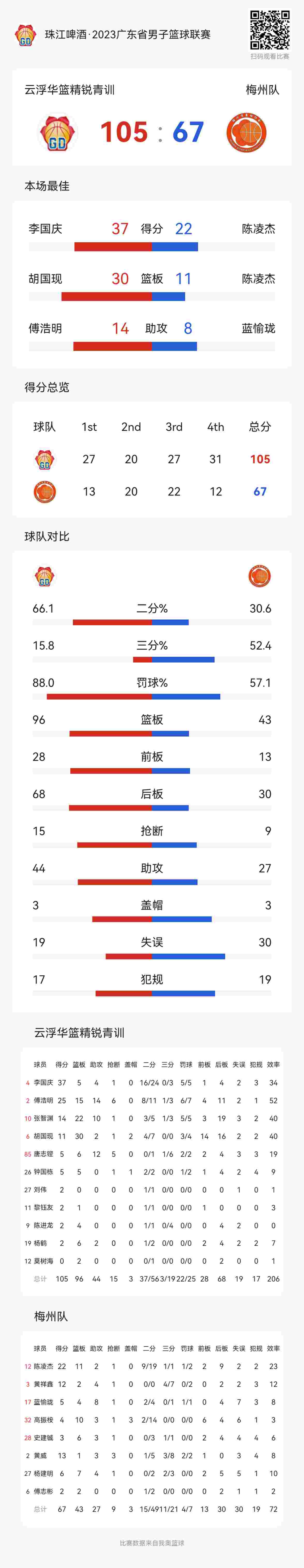 数据方面,云浮队4号李国庆37分5篮板4助攻、2号傅浩明25分15篮板14助攻的大号三双,本场的MVP给到的是4号李国庆。