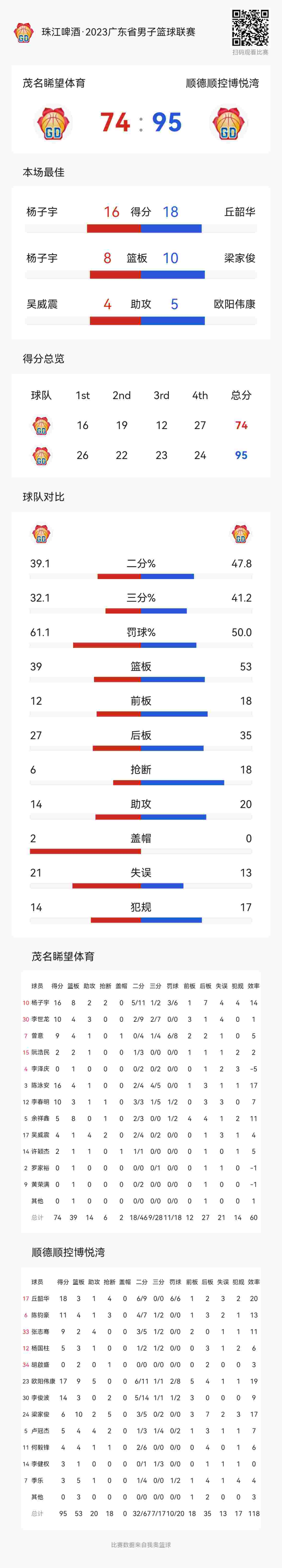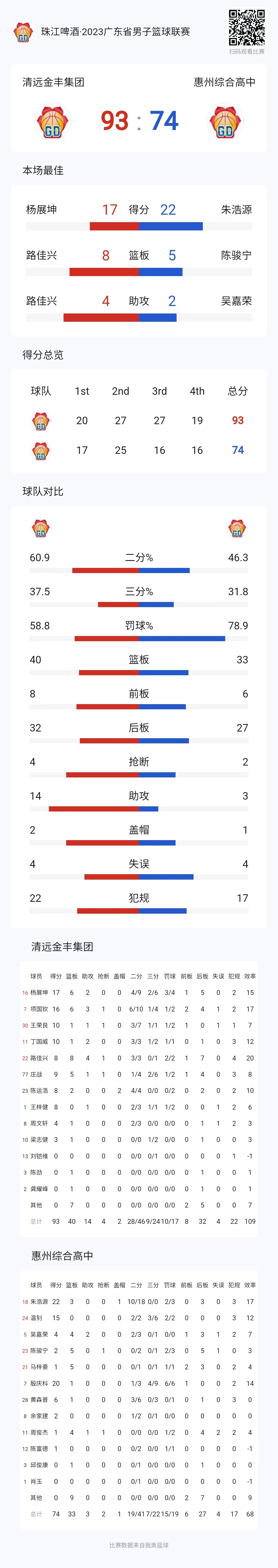 双方得分最高球员:佛山队:吴远根,22分;广州队:张济洲,23分