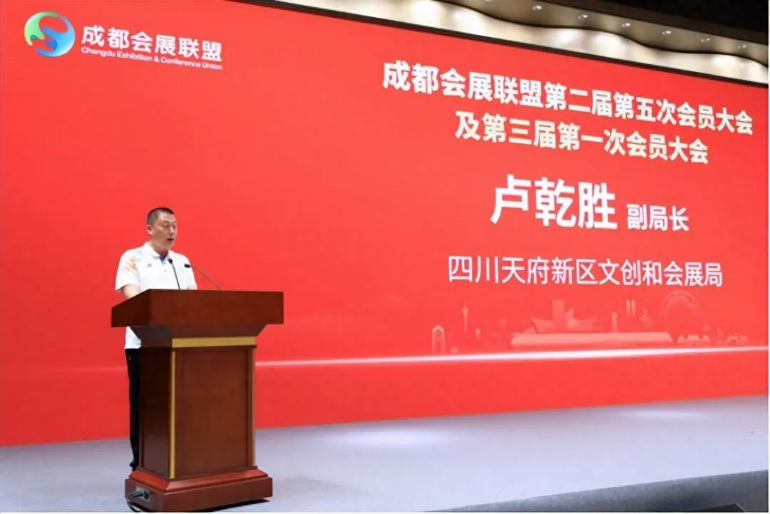 天府新区文创和会展局副局长卢乾胜代表文创会展局发言,指出会展业作为现代服务业的重要组成部分,是衡量城市开放程度、经济活力和发展潜力的重要标志。近年来,天府新区认真贯彻落实市委、市政府关于推进产业建圈强链和建设国际会展之都的决策部署,加快推动会展业高质量发展,初步形成“展产融合、以展兴城”的良好态势,感谢成都会展联盟上届理事会的付出。希望联盟新一届理事会继续围绕“服务政府、服务企业、服务社会”的宗旨,加强联盟自身能力建设,进一步发挥会展资源整合和企业竞合的优势,助力会展企业在新区集聚发展,促进新区会展全产业链集聚成势。新区也将全力支持成都会展联盟各项工作开展,竭诚为广大会展企业提供更多优质高效服务、创造更多有利发展条件。