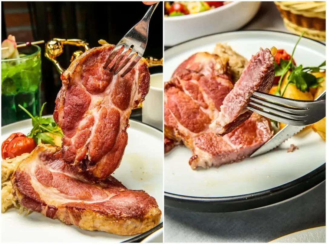 两大块猪排经过德式烟熏的制法,呈现出诱人的美味!猪排肉肥瘦相间,吃起来口感很好,带着股烟熏的香气。搭配上酸菜解腻,让人忍不住一口接一口。