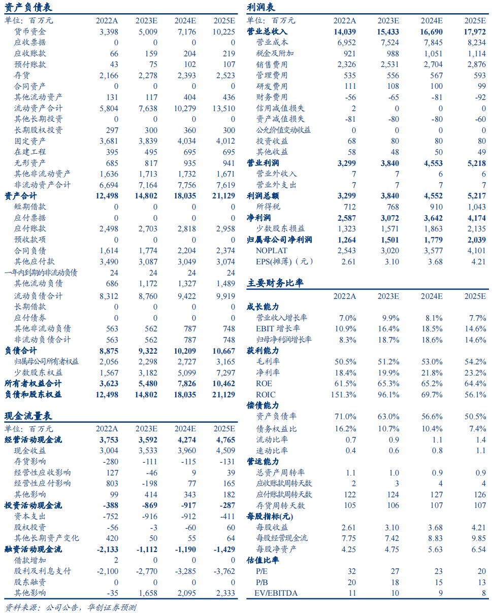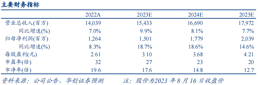 渠道精细调整中,成本优化成亮点。受消费力及渠道力掣肘,Q2高端产品增长仍偏缓,但公司渠道精细化调整持续推新,经营正在逐步企稳。同时成本压力拐点已至,吨价-吨成本剪刀差扩大有望带动盈利逐步释放。中长期看,公司品牌塑造能力强,调整到位后高端化与全国化仍可行稳致远。考虑疆外乌苏复苏不及预期,我们略下调2023-2025年EPS预测至3.10/3.68/4.21元(原23-25预测为3.17/3.81/4.47元),对应23-25年P/E为27/23/20倍。给予24年目标PE30X,对应目标价110元,维持“强推”评级。