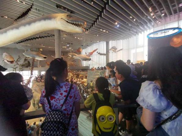 走入生命长河厅中,一条承载着大量动物标本和模型的展区呈螺旋状蜿蜒而下,小朋友们走入其中仿佛身临其境,蓝鲸、大白鲨,片片鱼群从身边游过,雀儿鸟儿展翅而飞,小猴子好奇张望,狮与虎威风矗立,还有那凝望着你的恐龙……这恢弘的生命长卷缤纷绚丽让孩子们惊叹不已,连连称赞。