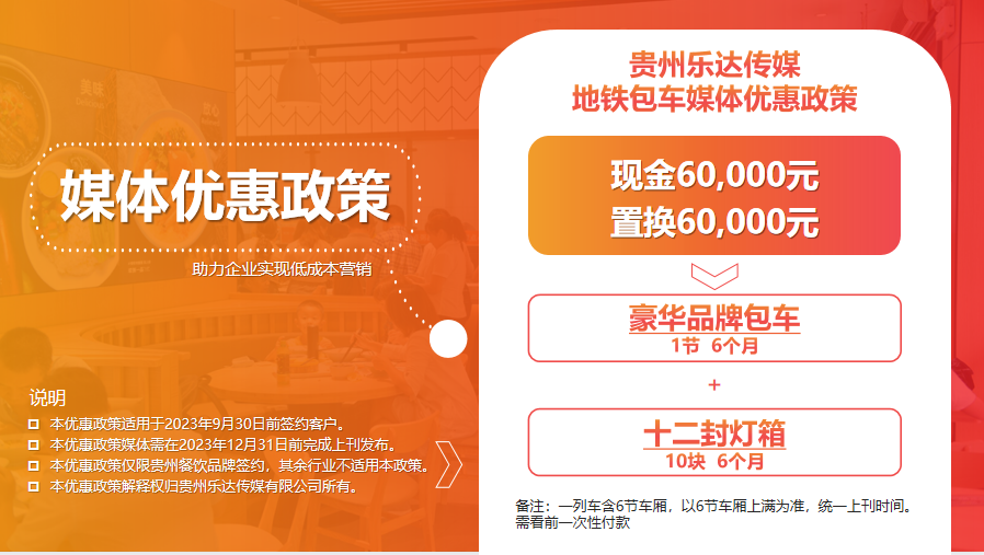 承诺凡是在2023年9月30日前签约的餐饮品牌用户,都可以享受豪华品牌包车(1节车厢)6个月时效+十二封灯箱(10块)6个月时效,以此帮助贵州餐饮企业实现一次高质量低成本的宣传营销。