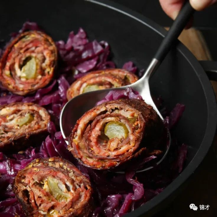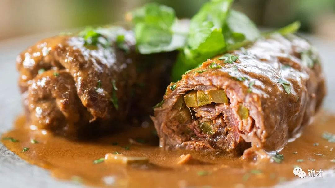 然后将原料卷起来,用绳子、木签或特殊的肉卷架固定在一起,油煎后并慢慢煮熟。