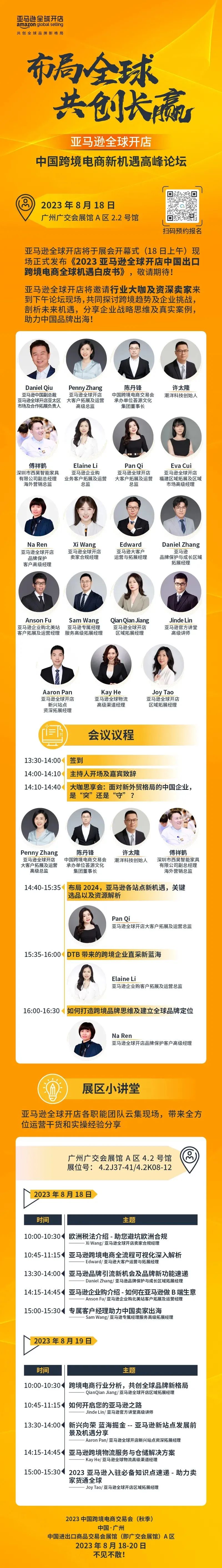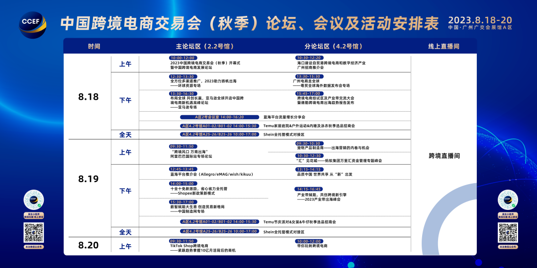 展会开幕当天上午将举办2023中国跨境电商交易会(秋季)开幕式暨中国跨境电商发展论坛,邀请政府商务主管部门领导、国内外知名电商平台高管、营销渠道代表、服务商龙头、跨境电商行业协会、专家学者等就国家支持跨境电商发展进行政策解读,就跨境电商新现象进行“新机遇、新动能、新技术、新变化”主题分享。亚马逊全球开店将深度参与本届跨交会,首次在同类展会期间发布《2023亚马逊全球开店中国出口跨境电商全球机遇白皮书》,并确认今后每年该白皮书都将在跨交会期间发布。德勤中国将在展会现场发布《中国跨境电商出海趋势报告》。新锐平台TEMU和独角兽平台Shein将举办专场对接会,阿里巴巴国际站、Shopee、中国制造网、米多多、eBay、粤贸全球等分别就平台、独立站、DTC品牌出海实战策略分析、海外消费市场大数据领域进行最新趋势专题分享。