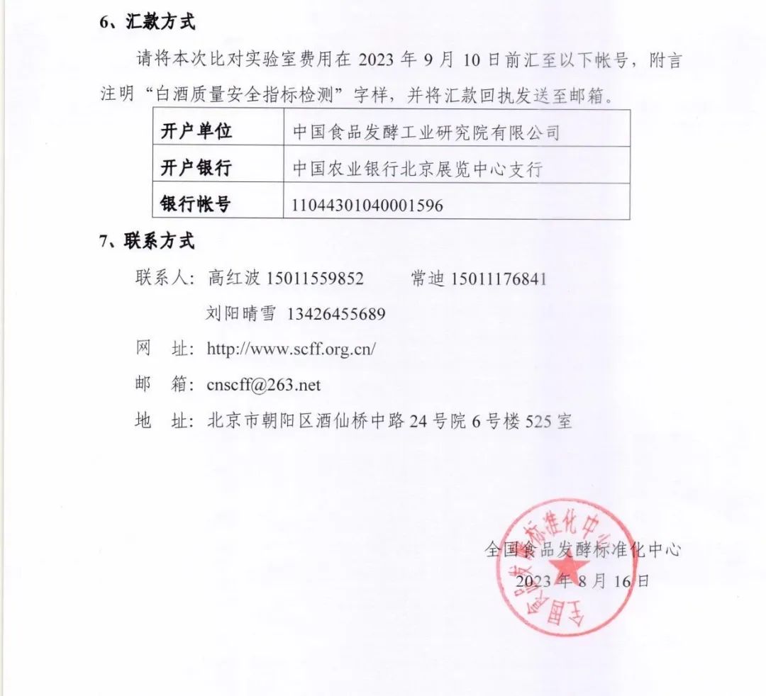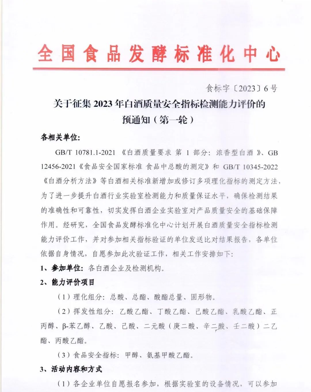 关于征集2023年白酒质量安全指标检测能力评价的预通知(第一轮)