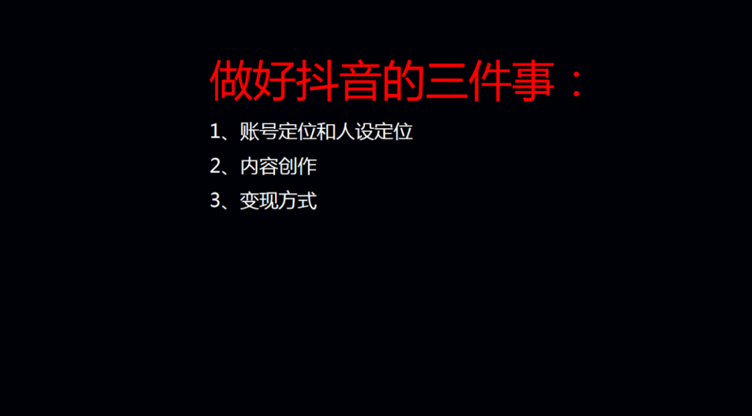 我总结了做好抖音的三件事儿,第一个是账号的定位和人设的定位;第二个是内容的创作;第三个是变现的方式。