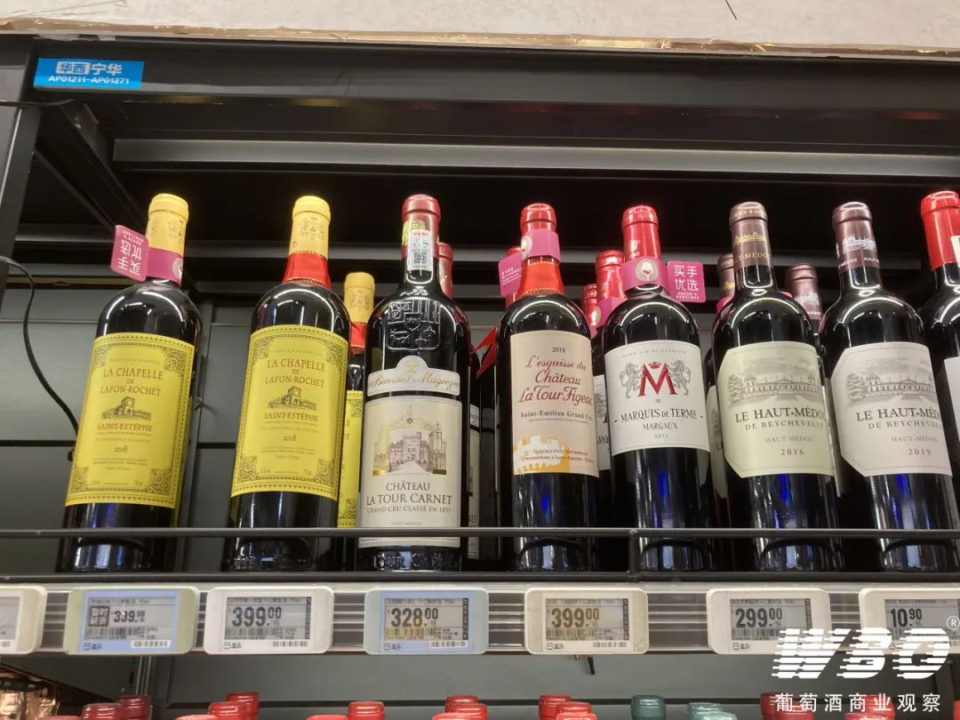 WBO在成都的几家盒马鲜生观察到,除了少数有标杆价格支撑的知名品牌,目前主推的葡萄酒绝大部分以100—300元价位带为主。