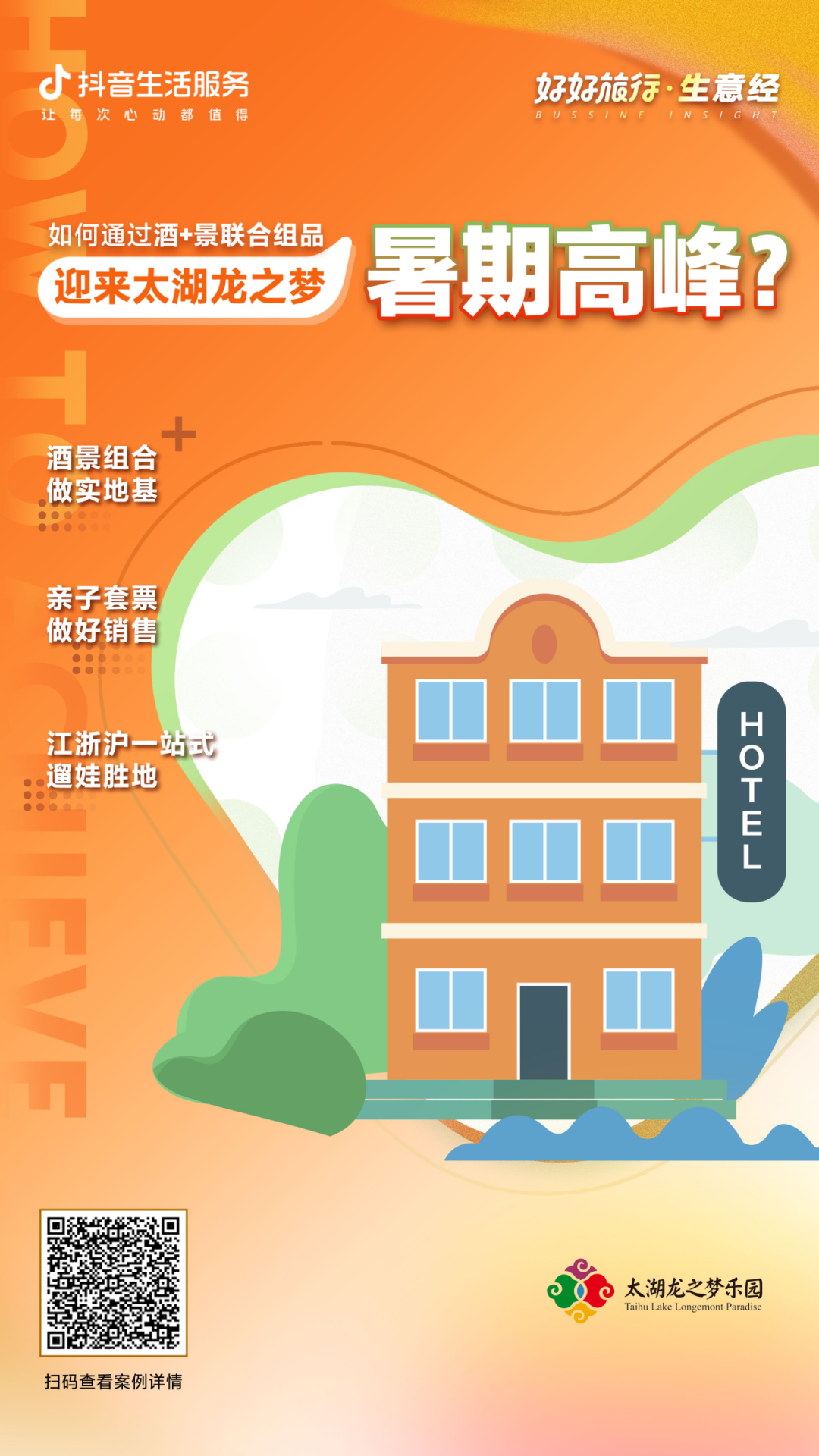 太湖龙之梦乐园也在“好好旅行生意经”中透露出自己与市面其他旅游产品不一样的方法论。根据景区整体酒店+景区的基建,将最具备性价比的产品组合、最舒服的产品组合作为主推品,太湖龙之梦乐园以“舒适”、“一站式”为主打内容。相比市面上许多节奏过快的旅游方式,龙之梦乐园从用户思维出发,将产品卖点与消费需求做好平衡,切身考虑出行人对于旅行舒适度与性价比的需求,真正契合“好好旅行”主题,还与抖音平台深度建联,在引流方面做出充分沟通,最终整体的传播和销售策略都产生了良好的走向,新的酒店项目销售额达到了5000 多万元,旅游产品成功实现破圈传播效果,6月份销售额 GMV 近亿元,7 月份景区的流量基本上每天达到5万人左右。