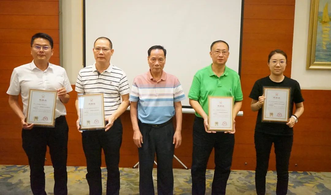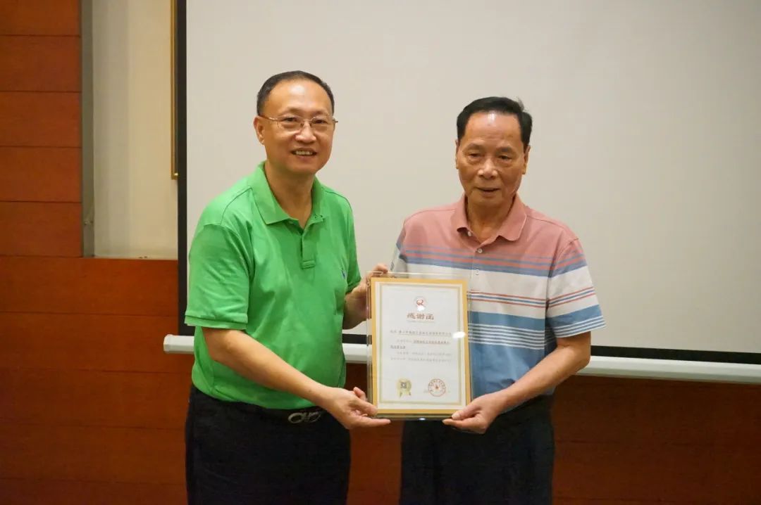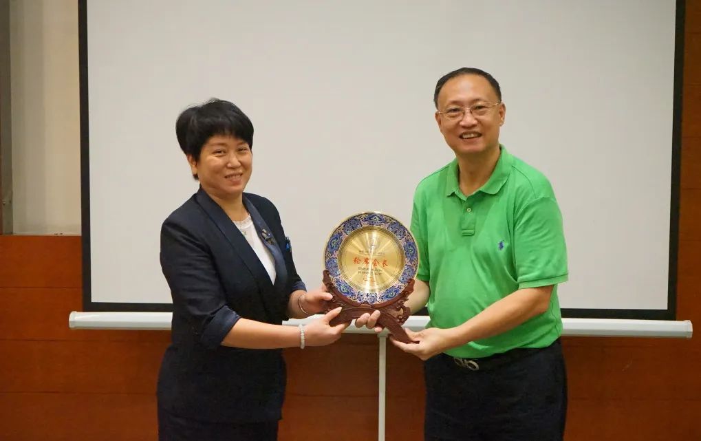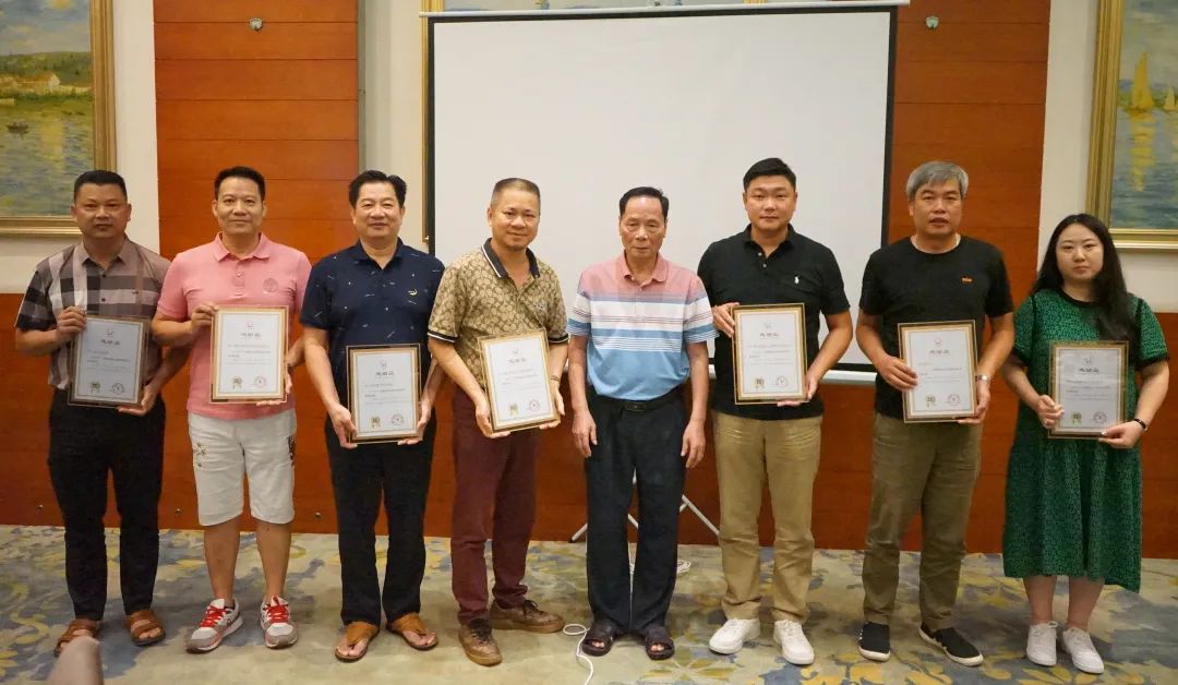 容桂餐饮行业协会会长罗兆波授轮值会长纪念牌给8月轮值会长、容桂餐饮行业协会副会长林惠欢