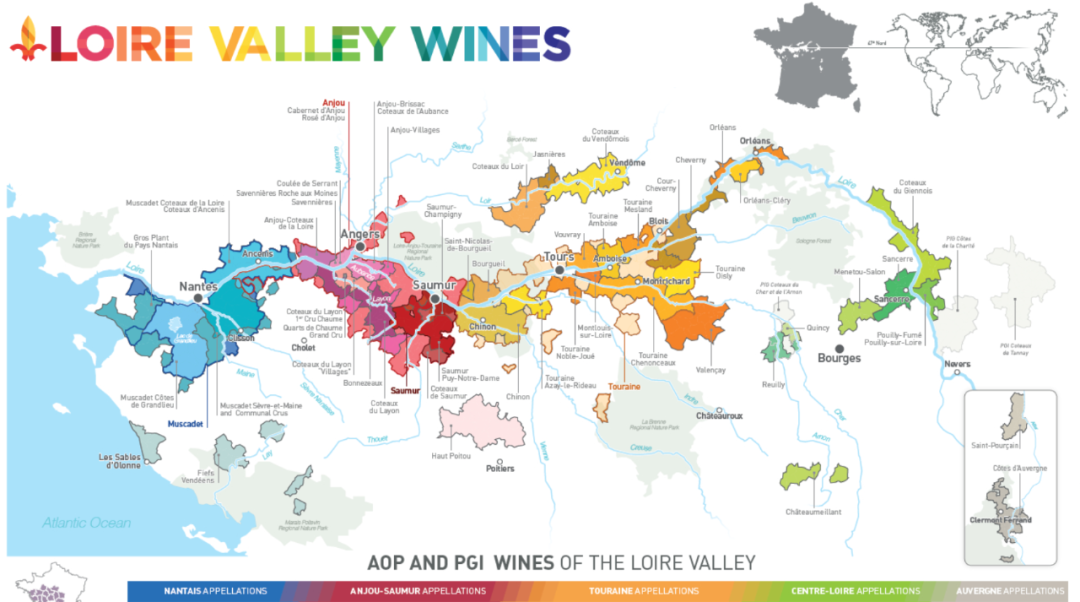 地图上长条形状的卢瓦尔河谷(The Loire Valley),气候变化多端,划分为四个子产区,从大陆性气候到海洋性气候,每个都有自己不一样的气候类型,但总体偏凉爽。