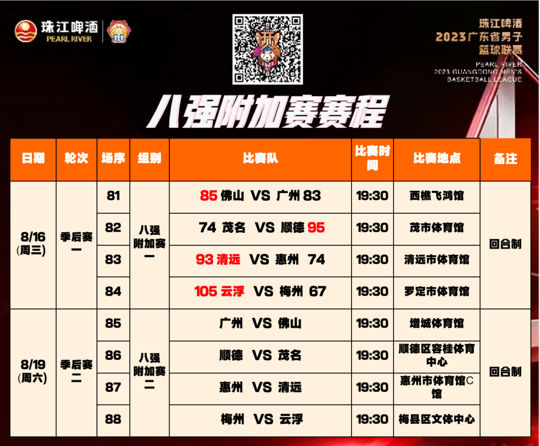 ★主、客场两回合比赛中,每场比赛均必须决出胜负结果(即是在第 4 节比赛结束时比分相等,必须再继续若干个 5 分钟的决胜期,决出本场比赛胜负结果)。