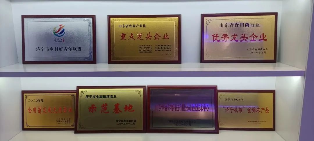 公司先后荣获中国食用菌行业食用菌示范基地、山东省食用菌行业优秀龙头企业、山东省生态循环农业示范企业、山东省农业产业化重点龙头企业、济宁市安全生产标准化二级企业、 济宁市生态循环农业示范基地、邹城市食用菌标准化示范区建设示范单位、邹城市社会贡献突出企业等荣誉称号。