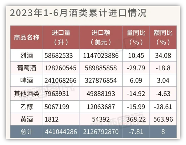 数据显示,2023年1-6月,我国酒类累计进口量为4.41亿升,同比下降7.81%,进口额为21.27亿美元,同比增长8%。纵向对比2019-2023年的进口酒数据,我们不妨看出洋酒在中国市场的微妙变化。