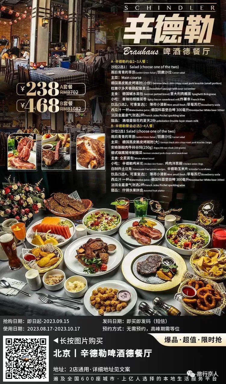 【辛德勒啤酒德餐厅】北京2店通用(798店+宋庄店)德国啤酒·德式黑啤烤脆皮咸猪肘·德式香肠拼盘·安格斯牛排,8年品质店,限时238元享约会2-3人餐,468元享聚会品质3-4人餐!来这里品尝原汁原味地道德餐~【无需预约】