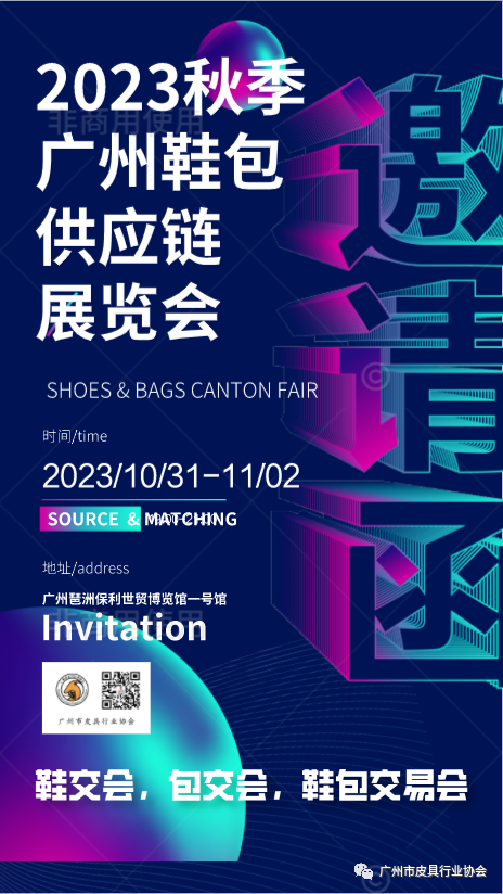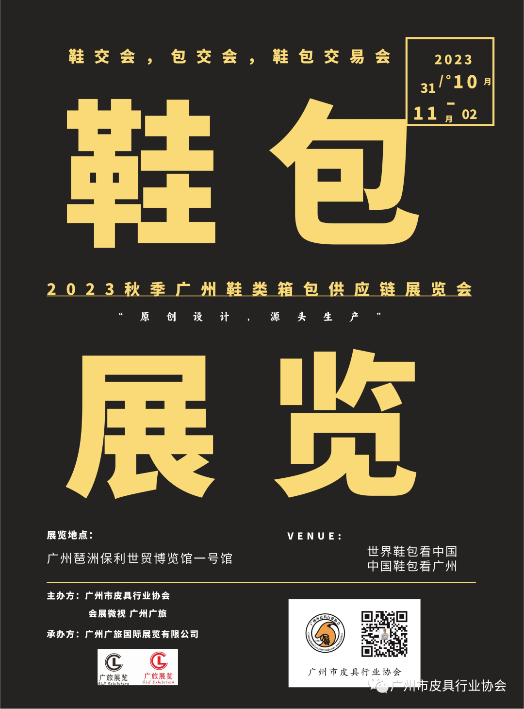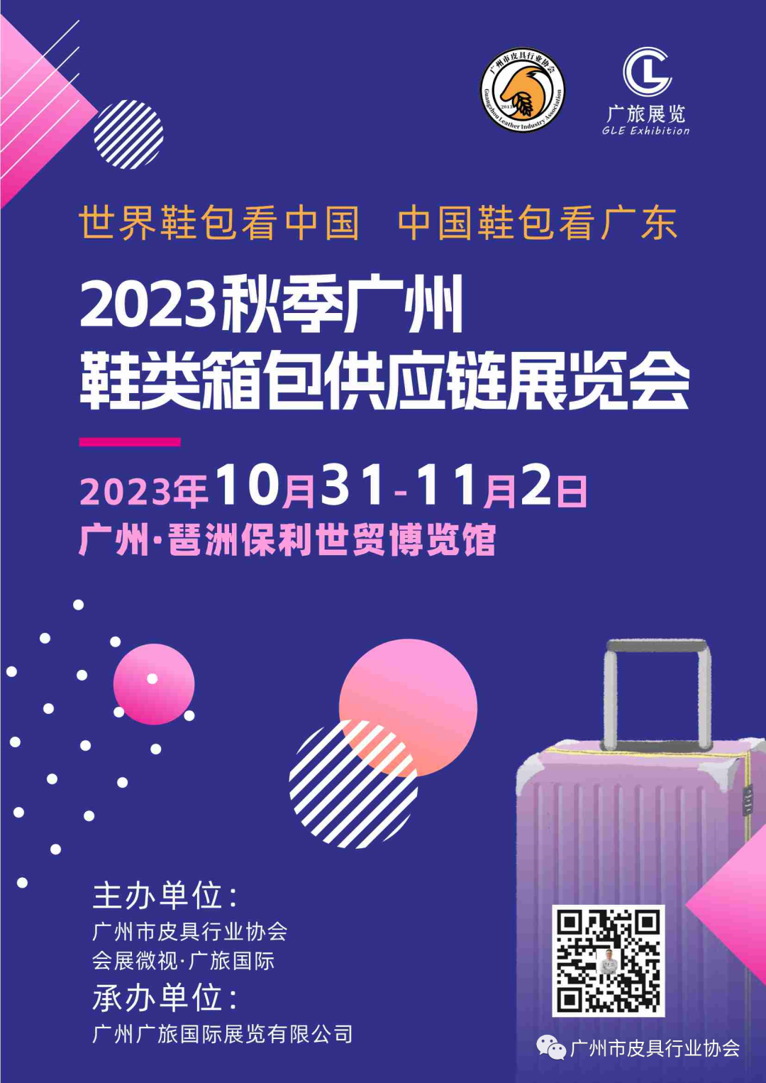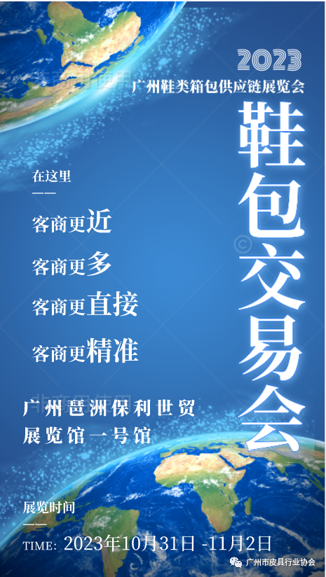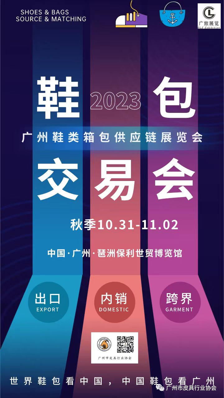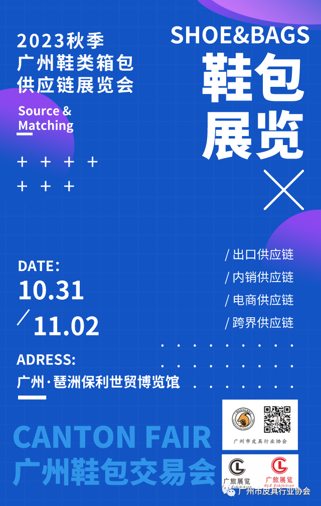 10月31-11月02日,“2023秋季广州鞋类箱包供应链展览会暨源头产品订货会”将在广州保利世贸博览馆一号馆盛大举行,10,000平米展览面积,汇聚近400家精选展商,现场活动与商贸配对也将一一呈现,带来一场链接鞋包供应链的商贸盛会。