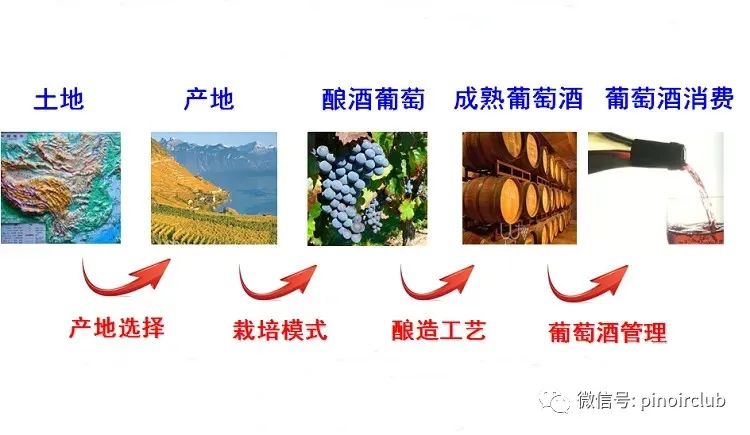 如果按照中国的阴阳五行说,影响葡萄酒的因素也可用它来概括。阴指大地,如土壤、地形、水分,阳指天,如阳光日照、气候天气。阴阳交泰指上述自然条件的结合、匹配,互动互补,使葡萄树开花结果,春花秋实。五行中“金”可指葡萄根系植深扎土壤中吸收各种矿物质,微量元素,决定了葡萄内涵的差异,约束酿造成酒的风格;“木”可指葡萄树养分源于吸收草木堆肥的营养,——各类氮、磷、钾、化合物物质以及葡萄树的剪枝,蔬枝、护理、葡萄酒榨汁发酵中对葡萄皮、碴、枝蒂的“木”质部份的取舍功夫;“水”既指葡萄生长发育的过程对水分的需求多寡,当地水质的成份差别,也指葡萄汁的成份,更指葡萄酒的成分,色、香、味表现,葡萄酒是自然是神恩赐给人类的一种特殊的有生命的水吗?“火”既指葡萄生命过程中的阳光(日照量、温度、能量)又指葡萄酒的发酵过程温度,二氧化碳生成排发,余热的挥放,以及葡萄酒的储藏温度,适饮温度,陈化温度;“土”既指地域、地形、地貌、土壤对葡萄树的影响,也指葡萄酒的收藏陈年(地窖),地理转移(运输)经销场地、环境地、品饮场地环境等。金、木、水、火、土五种因素又是互动的,也有相生相克!